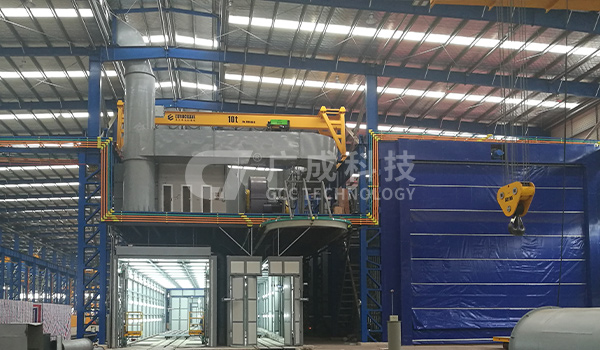 設(shè)備由噴砂房、清理房、底中面漆噴漆房、流平房、烘房、強(qiáng)冷室及輸送系統(tǒng)、電氣控制系統(tǒng)等組成,工藝要求不同,設(shè)備配置略有差異